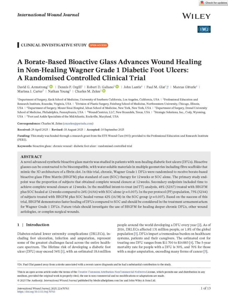 In a first-of-its-kind study amongst synthetic skin substitutes, Mirragen, a borate-based bioactive glass Fibre Matrix (BBGFM), demonstrated significantly improved wound healing at 12 weeks in Wagner Grade 1 DFUs compared to SOC, consistent with a previous pilot study and should be considered in the treatment arsenal for these types of chronic ulcers.